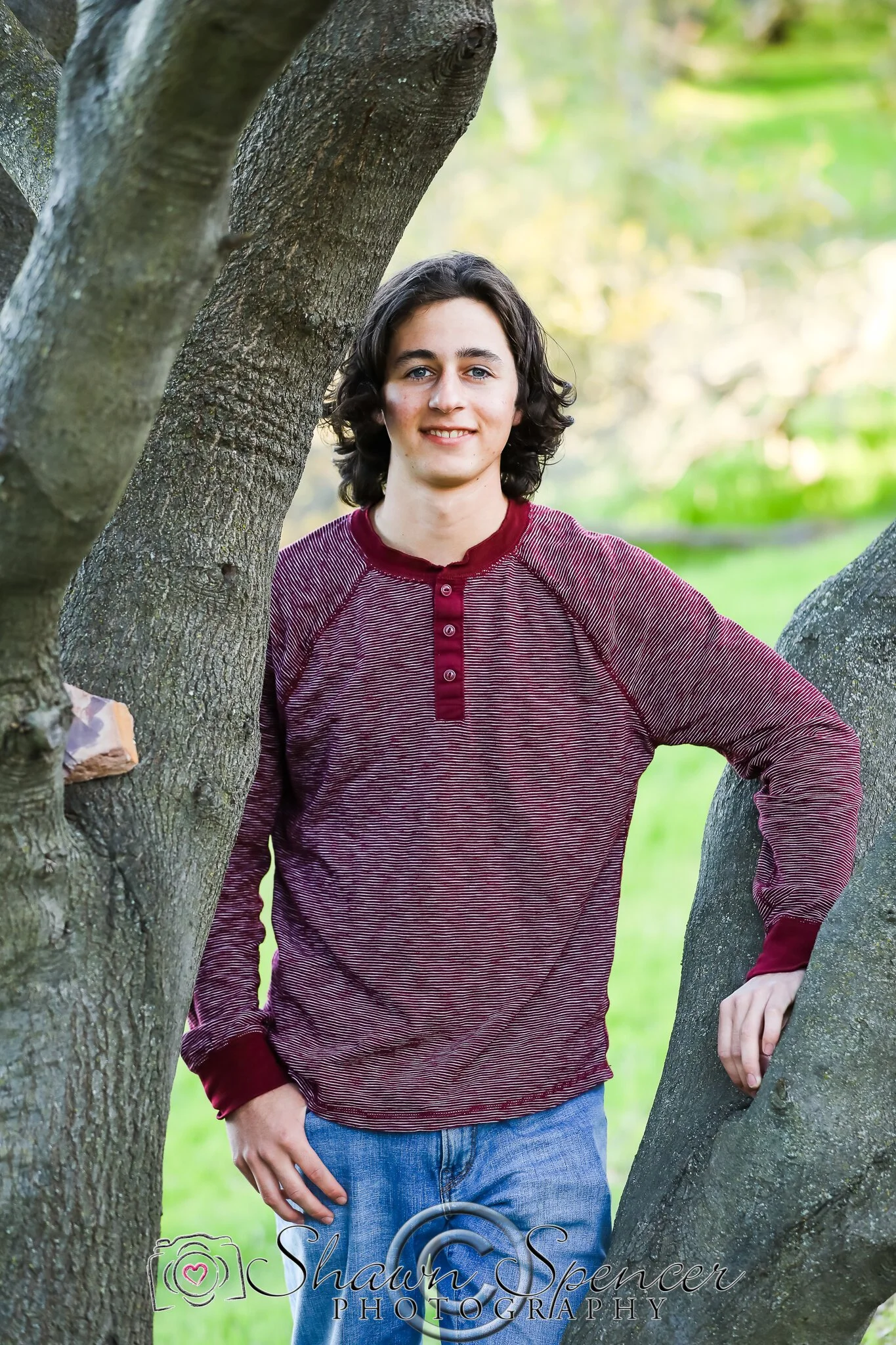 Senior boy facing camera right hand down thumb in pocket left arm resting on tree jeans and long sleeve shirt.
