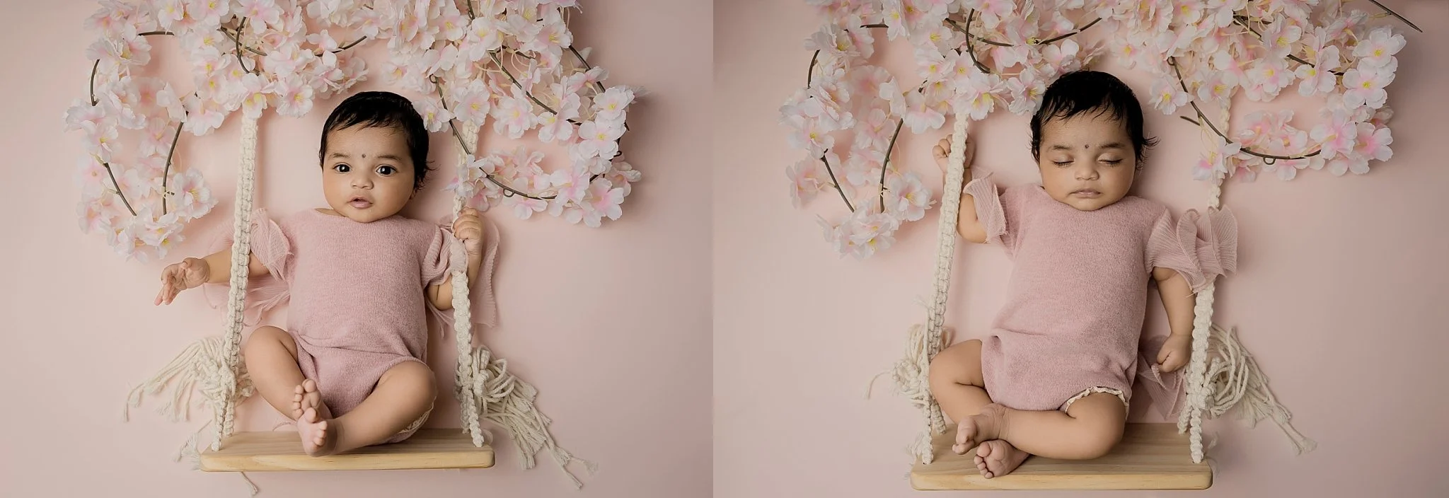 A highlight of the session was fulfilling Mom’s pose request — a floral swing setup inspired by cherry blossoms. Soft pinks and airy blooms created a dreamy, feminine scene, and Ishani looked absolutely angelic. Whether awake or snoozing, she seemed perfectly content swaying under her cascade of flowers.