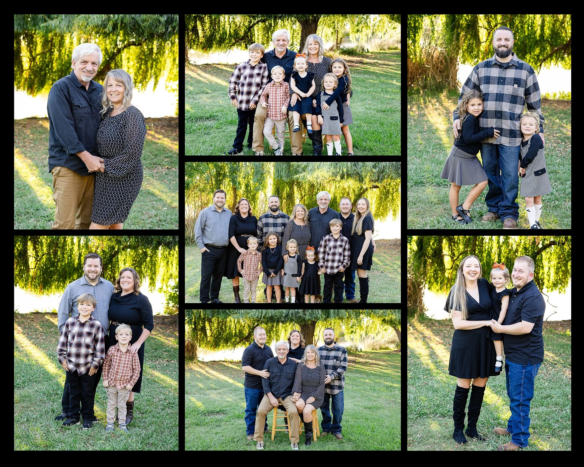 For extended family sessions, I always start with the big group shots. Everyone was perfectly coordinated in classic fall tones — black, gray, and warm plaid patterns that looked beautiful against the green grass and golden light. The Lewis family made it easy; there were so many genuine smiles and laughs shared between everyone. You could really feel how close-knit they are, and that warmth came through in every photo.