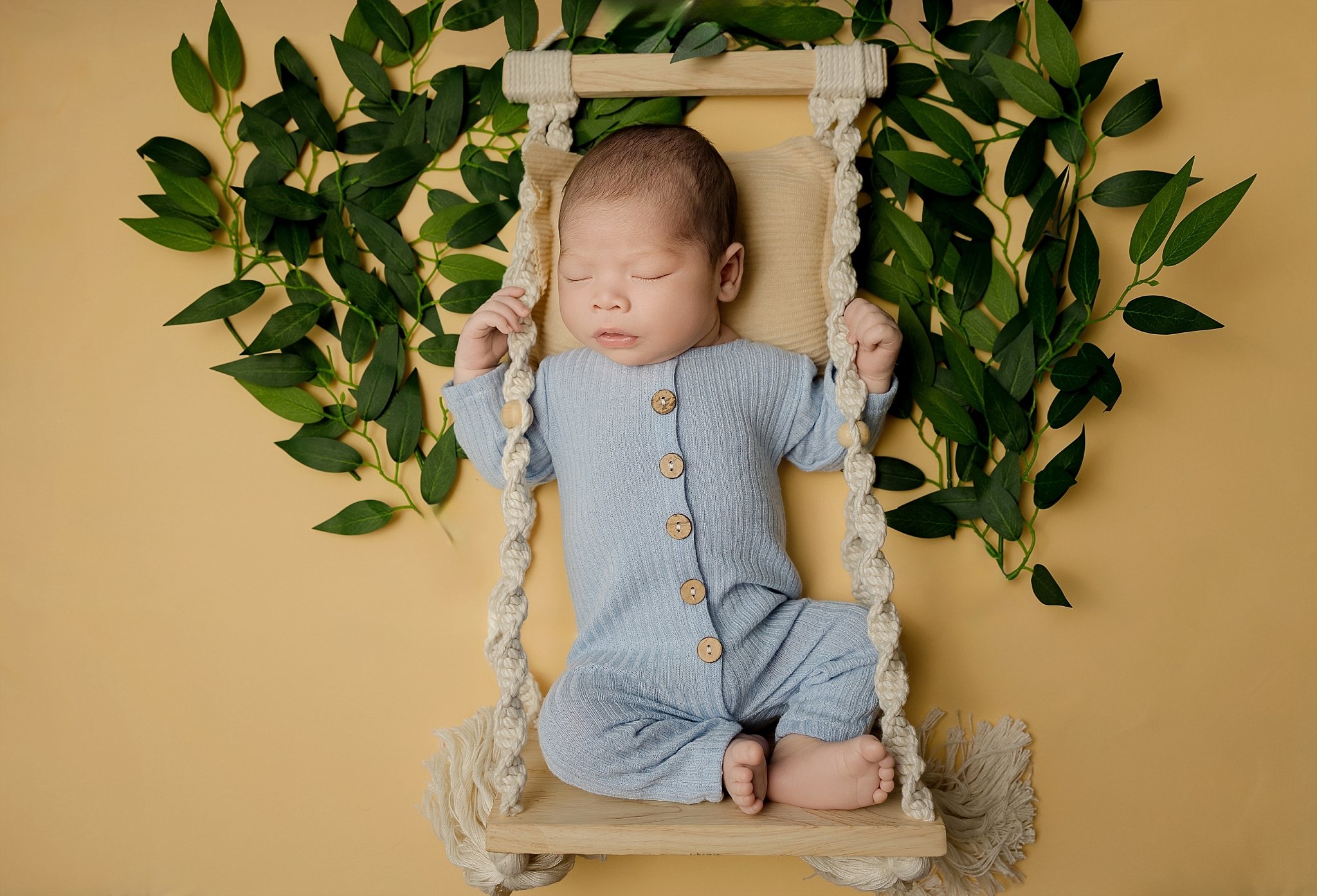 The swing setup was one of mom’s special requests — and it turned out beautifully! Surrounded by greenery and soft golden tones, Joseph looked so peaceful in his light blue romper. This setup added a fun, whimsical touch while still keeping the session cohesive with the color palette.