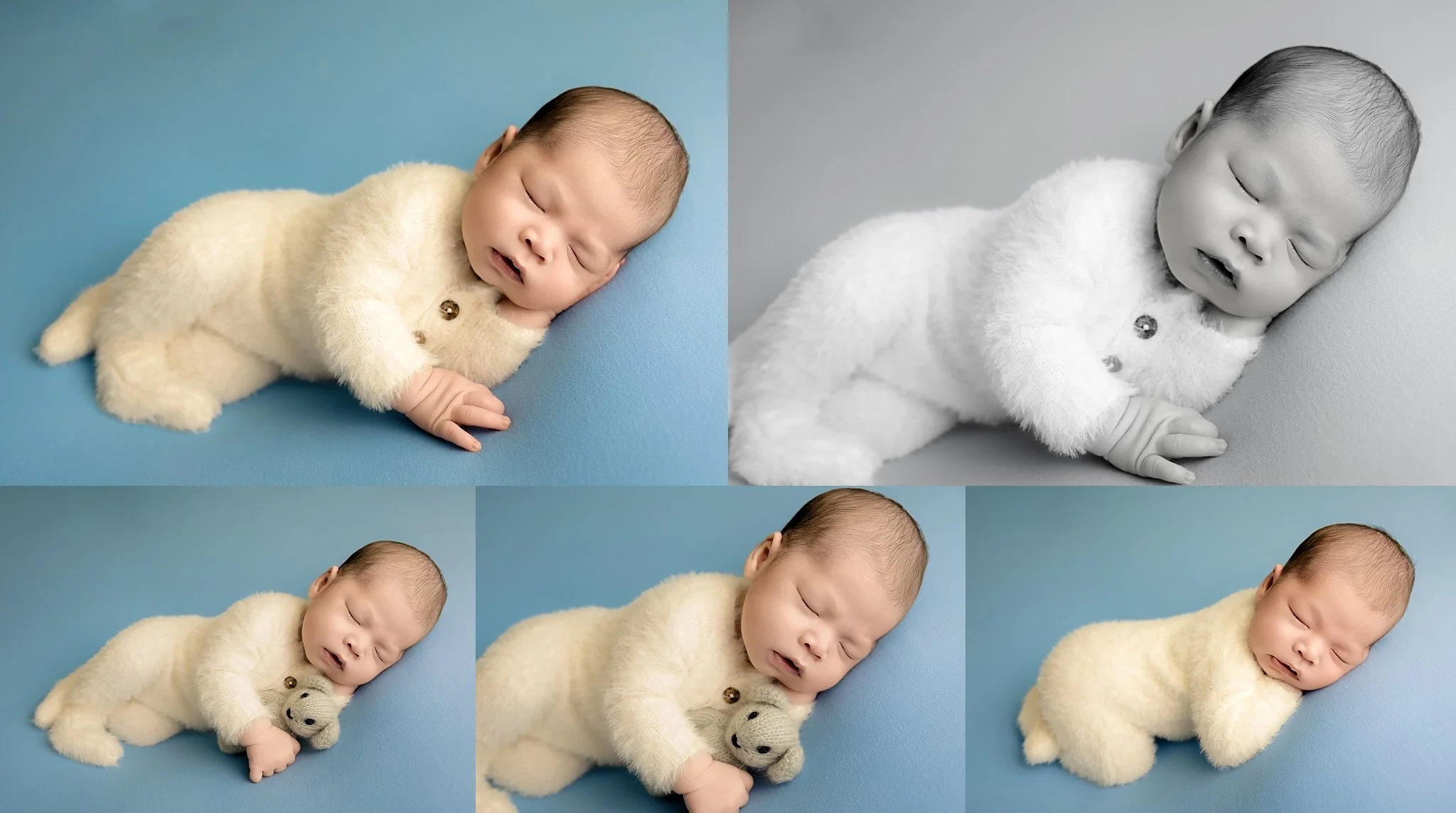 We also incorporated a soft baby blue setup — one of the colors mom specifically requested. Dressed in a fuzzy white sleeper, Joseph looked extra cozy as he rested peacefully against the blue backdrop. The tone felt classic and clean, giving his portraits that fresh, timeless newborn charm.