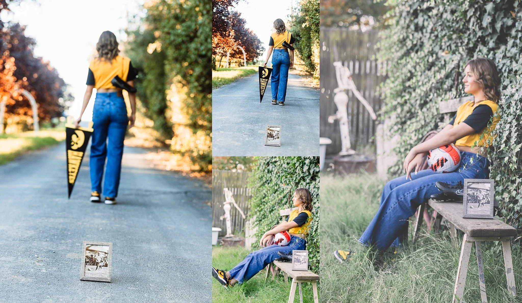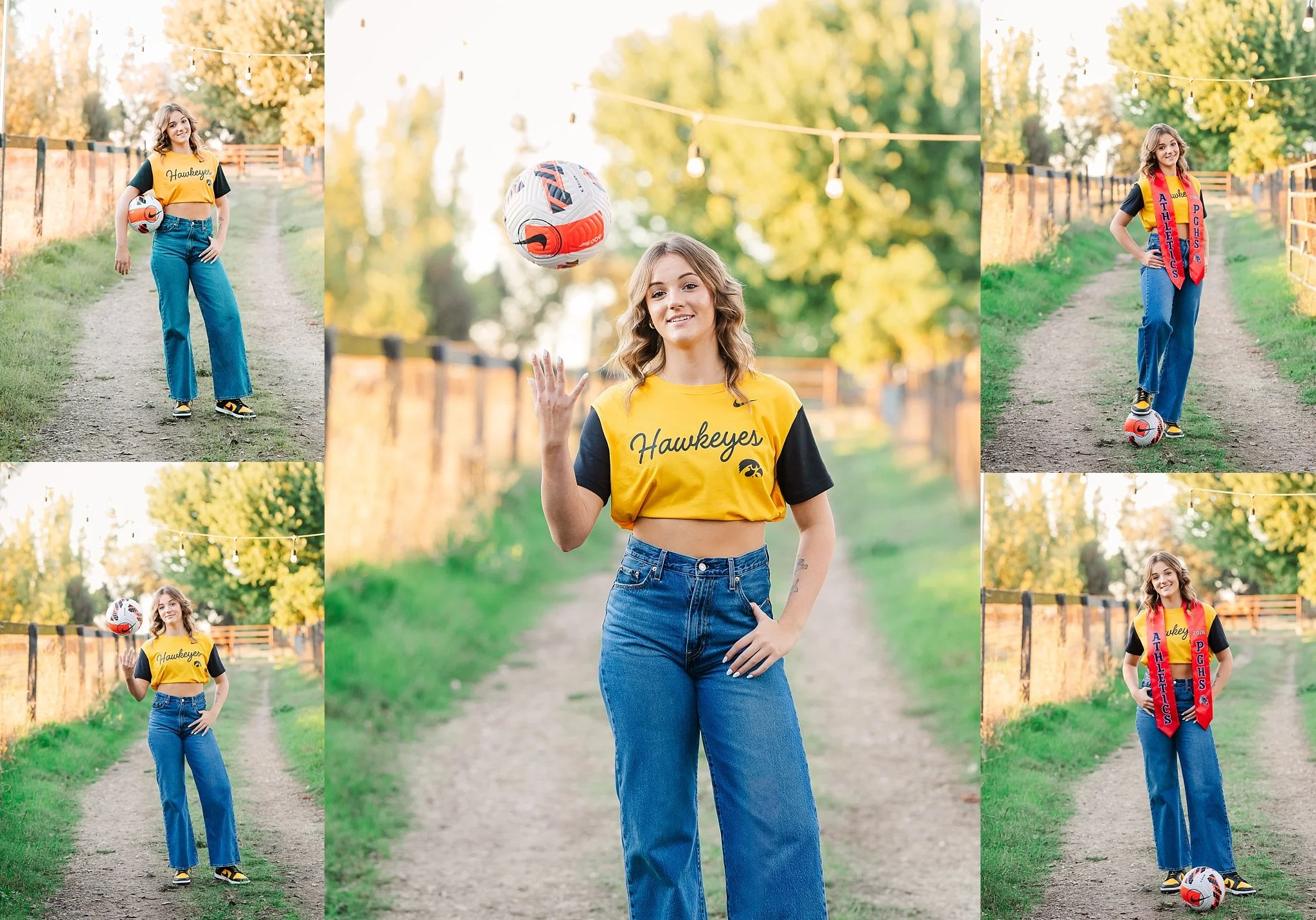 Kylee wrapped up her session proudly showing off her University of Iowa Hawkeyes gear. She paired her cropped yellow-and-black top with high-waisted jeans and her soccer ball—a fun nod to her scholarship and future college career.