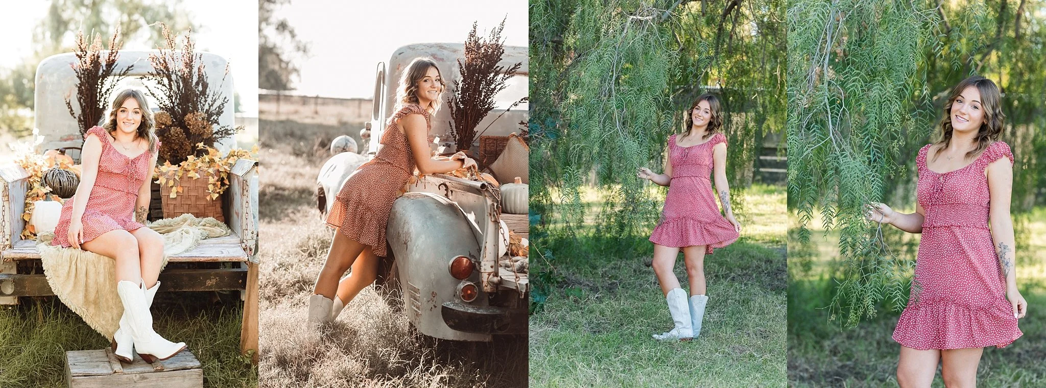 We circled back to another vintage truck for a soft, dreamy fall setup. Surrounded by dried florals and pumpkins, Kylee looked radiant in the warm golden light. Her red dress popped beautifully against the rustic backdrop and faded truck bed. She also stood by the beautiful willow tree on the ranch’s back pasture that has been on the property for over 50 years and with deep roots.