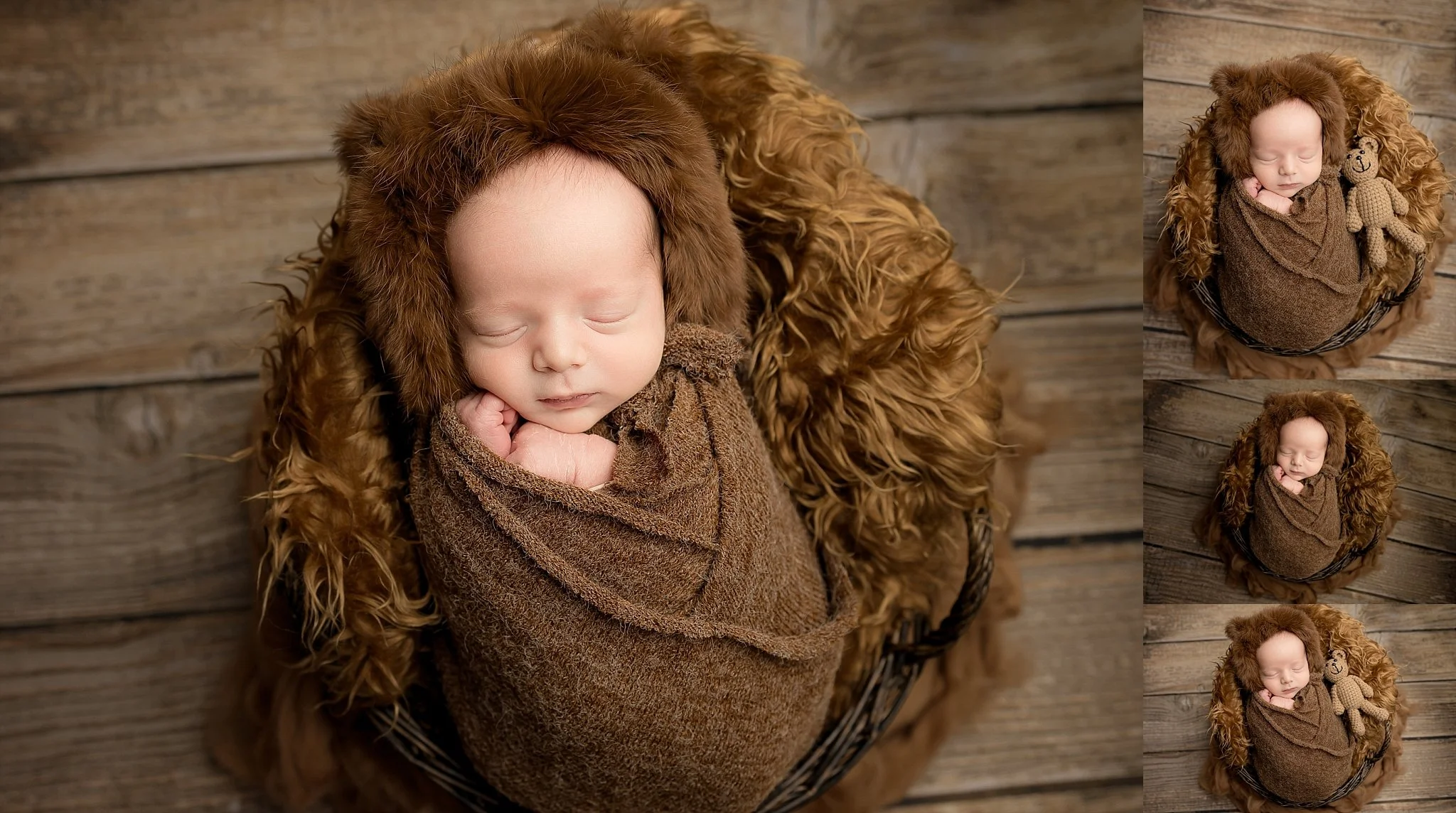 One of my favorite parts of the session was when Caleb transformed into a tiny brown bear! Wrapped in cozy brown layers and placed in a soft fur-lined basket, he looked every bit the cuddly little bear cub. I added a tiny crocheted bear for an extra sweet touch.