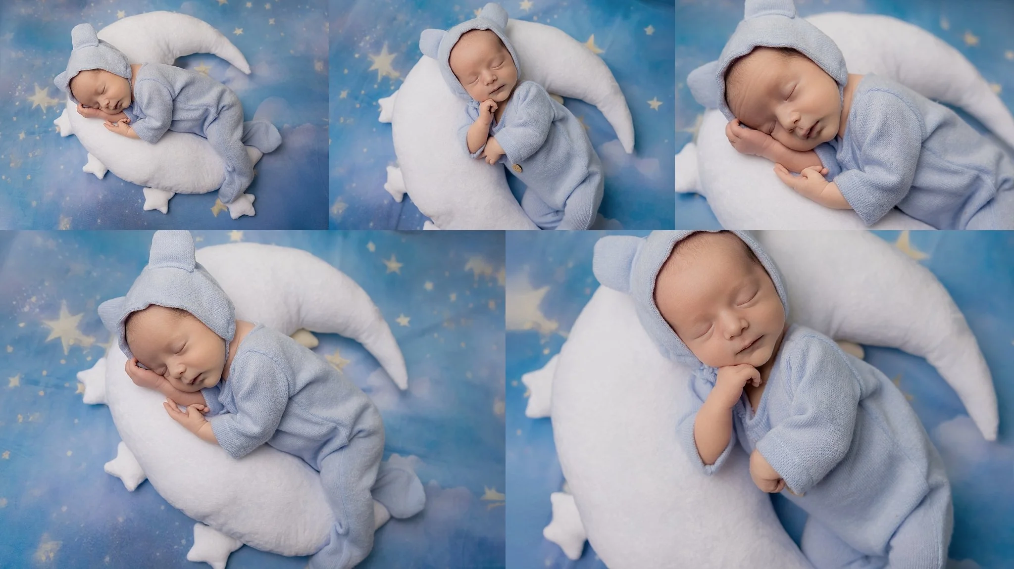 We ended the session on a dreamy note with a moon-and-stars setup, dressed in another soft blue outfit. Caleb rested gently on a crescent moon pillow surrounded by a celestial backdrop of stars and clouds. It felt magical — the perfect finish to his newborn portraits.