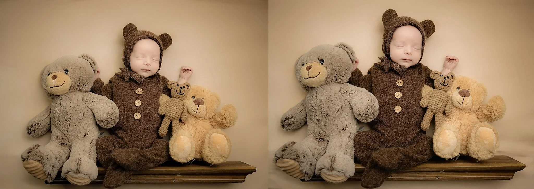We continued the bear theme having Caleb dressed in a brown bear romper, nestled between three adorable teddy bears “sitting” on a shelf. The soft beige background added warmth and a touch of nostalgia. This playful setup was one of those “everyone smiles when they see it” moments — perfectly sweet and timeless.