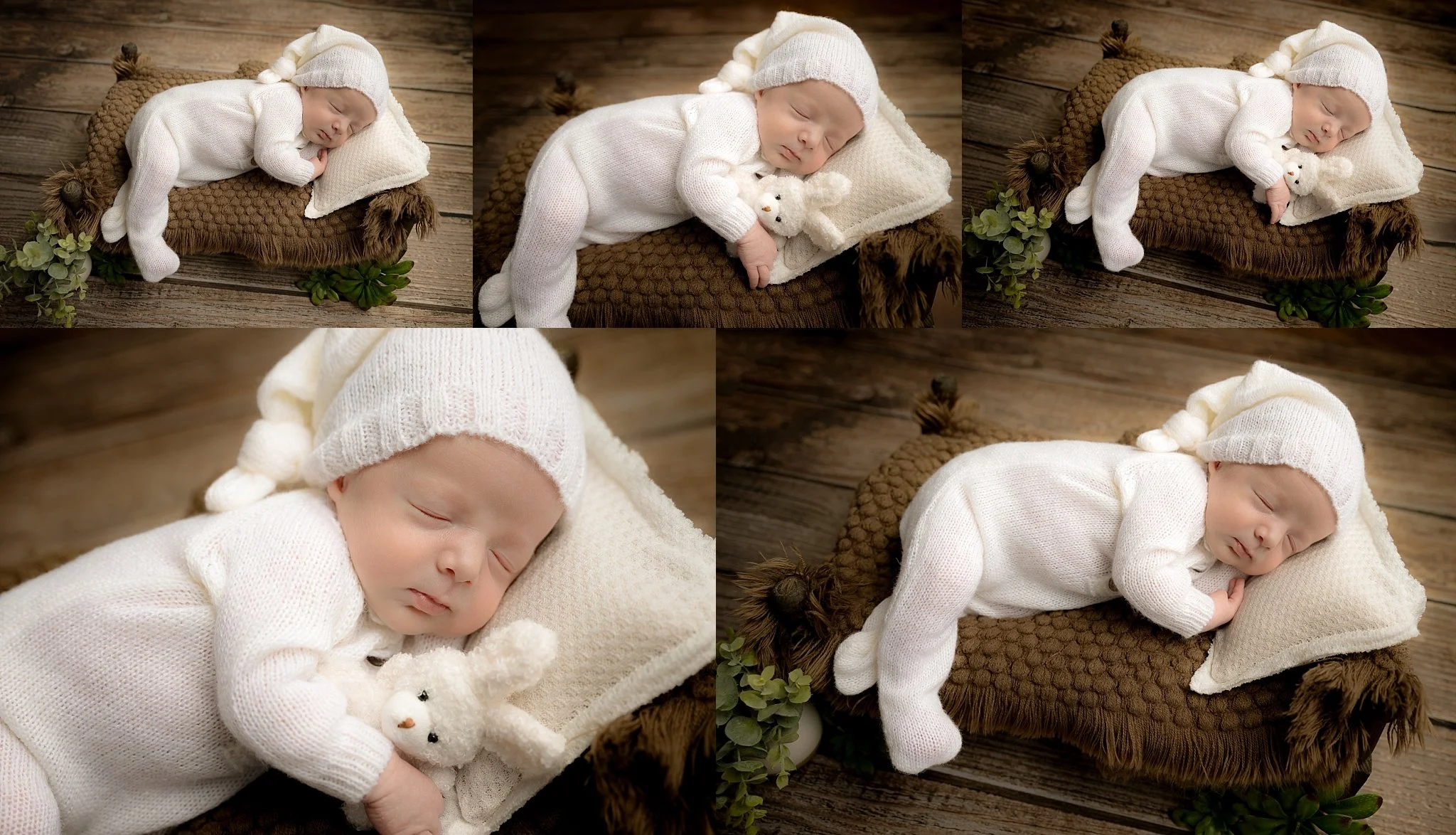 Next, we switched to a white knit outfit and bonnet, keeping things pure and classic. The neutral tones against the rich blue backdrop created a stunning contrast that brought out Caleb’s delicate newborn features. He looked so serene, especially when holding onto a tiny stuffed bunny — one of my favorite moments from this part of the session.