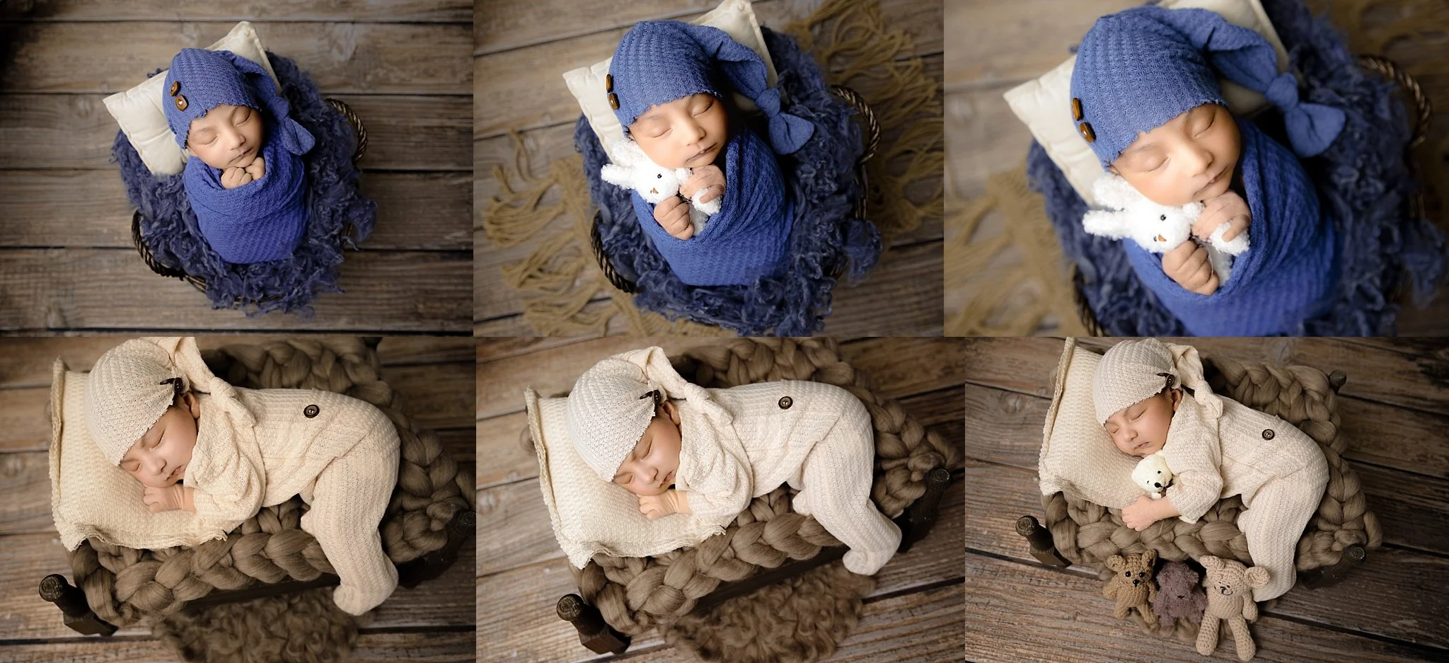 For the second look, we dressed Damian in a snug, oatmeal-colored knit romper with a matching cap—complete with button details—and laid him on a handmade mini bed. The neutral tones, warm woven textures, and soft brown wool layers underneath gave the scene an earthy, timeless feel. He looked like he was resting in the coziest little nook. We paired this off with the cutest little teddy bear that Damian was cradling on the bed.